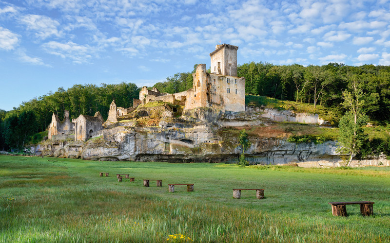Deep in a forested valley near Sarlat stands Château de Commarque, a dramatic medieval complex emerging from the rock itself. Built into a limestone cliff, the site once served as a fortified village with a tower, chapel, and troglodyte dwellings carved into the stone.