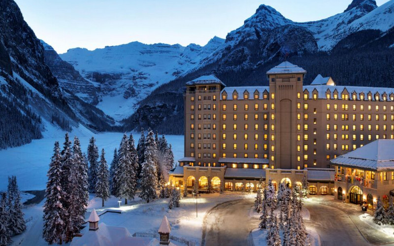 Set against a frozen turquoise lake and surrounded by the rugged Rocky Mountains, this grand hotel turns winter into something cinematic.