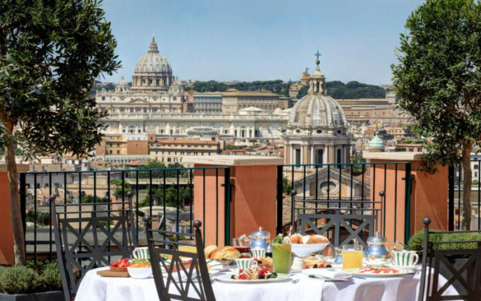 The rooms are bright and art-filled, with rich fabrics and playful Italian colors. The rooftop bar Cielo offers one of the best sunset views in Rome, while the Irene Forte Spa is a sanctuary for relaxation. Expect exceptional dining and a lively yet elegant atmosphere that captures Rome’s contemporary spirit.
