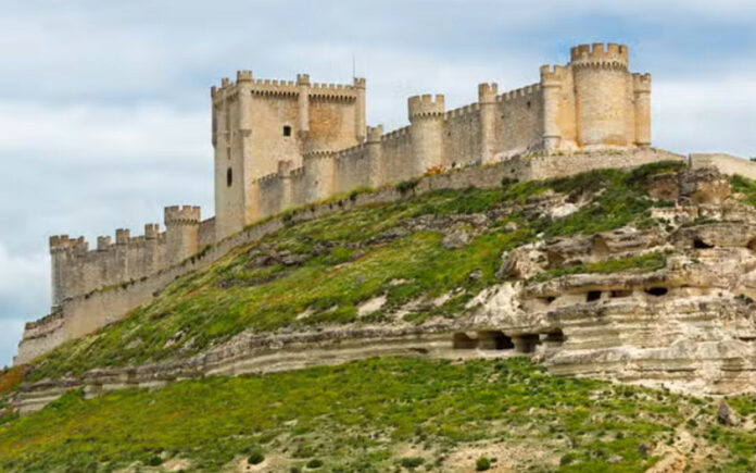 Stretching across a narrow ridge in Spain’s wine-rich Ribera del Duero region, Castillo de Peñafiel is shaped like a massive stone ship.