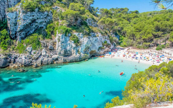 On the quieter island of Menorca lies Cala Macarella, a breathtaking cove framed by limestone cliffs and pine trees. The turquoise waters are almost impossibly clear, inviting you for a swim or snorkel among gentle waves.